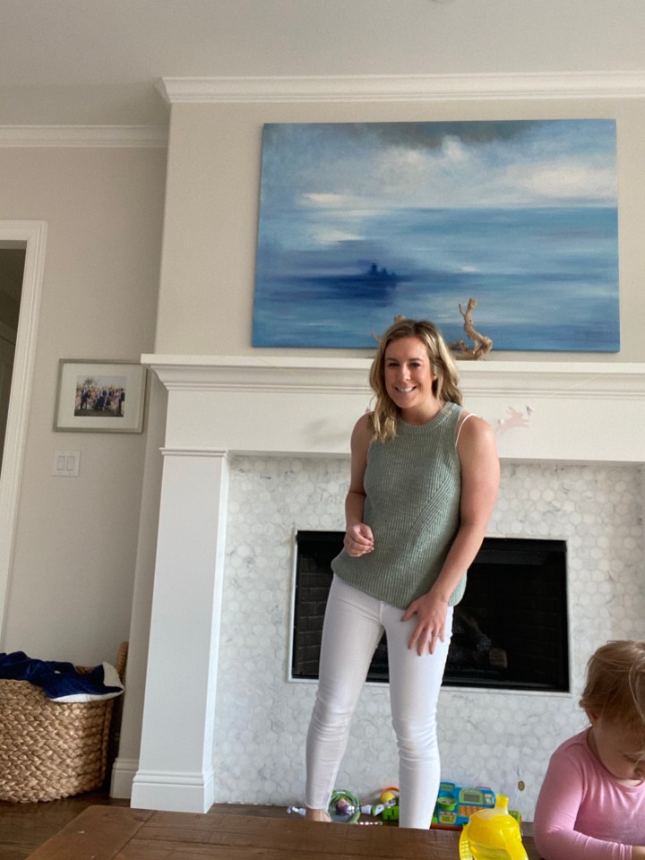 The next step is to set up your phone! Everyone thinks you need some sort of fancy tripod and all of this technology to get a professional looking self timer photo. But, honestly, since we’re all at home anyway, all you need is something tall enough to set your phone up on to be high enough to take an eye level photo. Here’s the set up I came up with today: