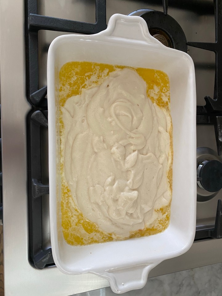 - Melt butter in a 12 x 9 inch baking pan. (Easiest step ever – throw it in the oven).
